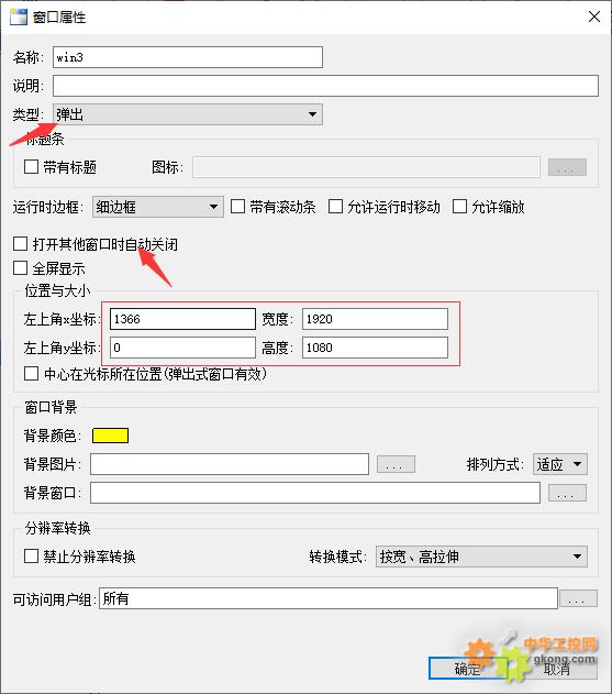 4. 如果想让某个窗口只在扩展屏显示,以屏幕分辨率1920*1080为例只需将窗口属性内的“左上角X坐标”设置成1366即可,其它参数无需更改(1366是主屏显示器的宽度)。