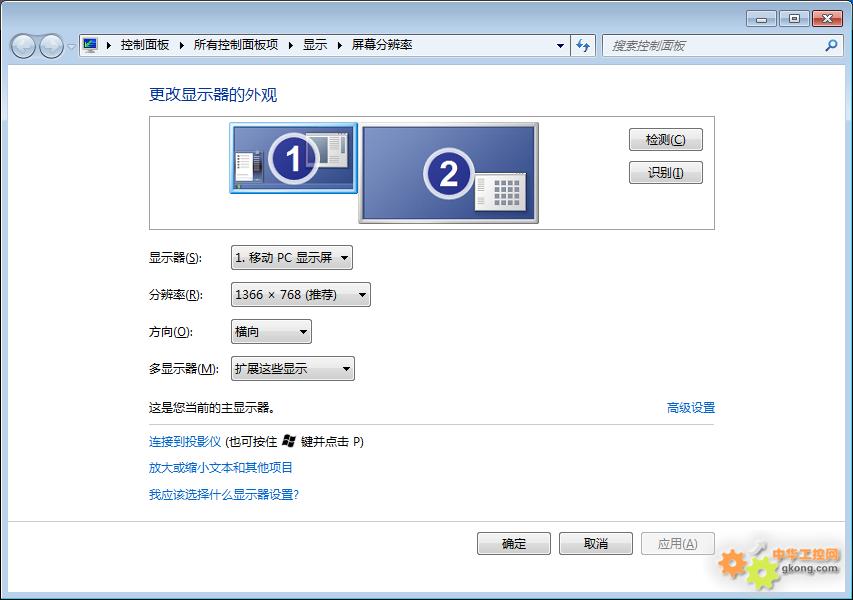 我们借助系统的扩展屏功能实现多屏显示功能,下面通过示例工程介绍多屏显示配置方法,以win7系统为例。