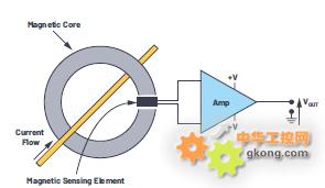 传感器由一个高磁导率环构成,感应电流导线通过该环。这会将被测导体周围的磁力线集中到一个霍尔效应传感器上,该传感器插在磁芯的横截面内。该传感器的输出经过预先处理,通常有不同的配置可供选择。最常见的有:0 V至5 V、4 mA至20 mA或数字接口。以相对低成本提供隔离和高电流范围的同时,绝对精度通常不低于1%。