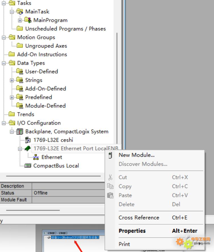 点击Borwse选择eds文件所在位置,在Ethernet Prot处右键选择New Module添加Modbus转EtherNET/IP网关模块。
