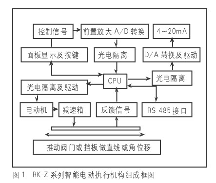针对上述问题,上海锐凯仪表有限公司花大力气开发了新一代RK-Z系列智能电动执行机构,较好解决了这些缺陷和不足。RK-Z系列智能电动执行机构系统构成见图1所示。它采用全封闭、一体化结构,配以单相永磁式交流同步电动机,体积小、重量轻、结构简单、传动惯量小、转矩大等特点。限位和刹车采用逐步逼近电子技术,实现了阀门“柔性全开”和“柔性全关”,取消了限位开关和刹车片,解决了长期以来困扰的限位开关易失灵、刹车片易“抱死”以及刹车时易产生大冲击电流烧坏电动机等老大难问题。为提高整机可靠性,采用了可靠性设计、可靠性试验、失效分析和严格的筛选、老化等工艺措施,并最大限度地减少了可动部件,使整机MTBF值达到40000万小时以上。