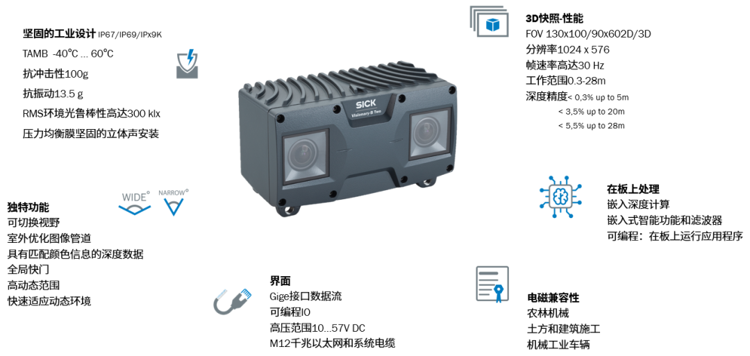 出口市场拓展:中国工程机械出口占比持续提升(2023年挖掘机出口占比41%),东南亚、非洲等地区对性价比高、适应性强的设备需求旺盛。SICK的3D双目相机Visionary-B Two便于快速适配不同地区机械标准,抢占海外智能化升级先机。