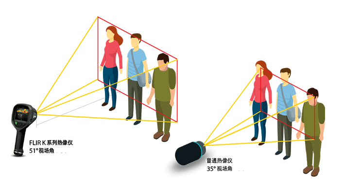 FLIR K系列热像仪采用接近人眼视觉的广角镜头,让您能在现场看清整个情况。例如,FLIR K系列(K45、K55、K65)的水平视场角为51°,它可以同时看到三个人,而普通热像仪的视场角只有25°,只能显示全一个人。